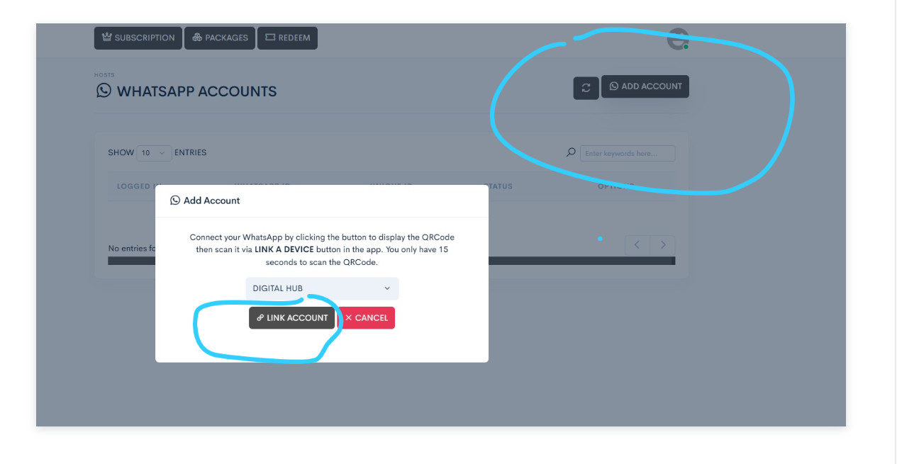 Click HOST → WhatsApp → Add Account → Link Account → Scan QR Code